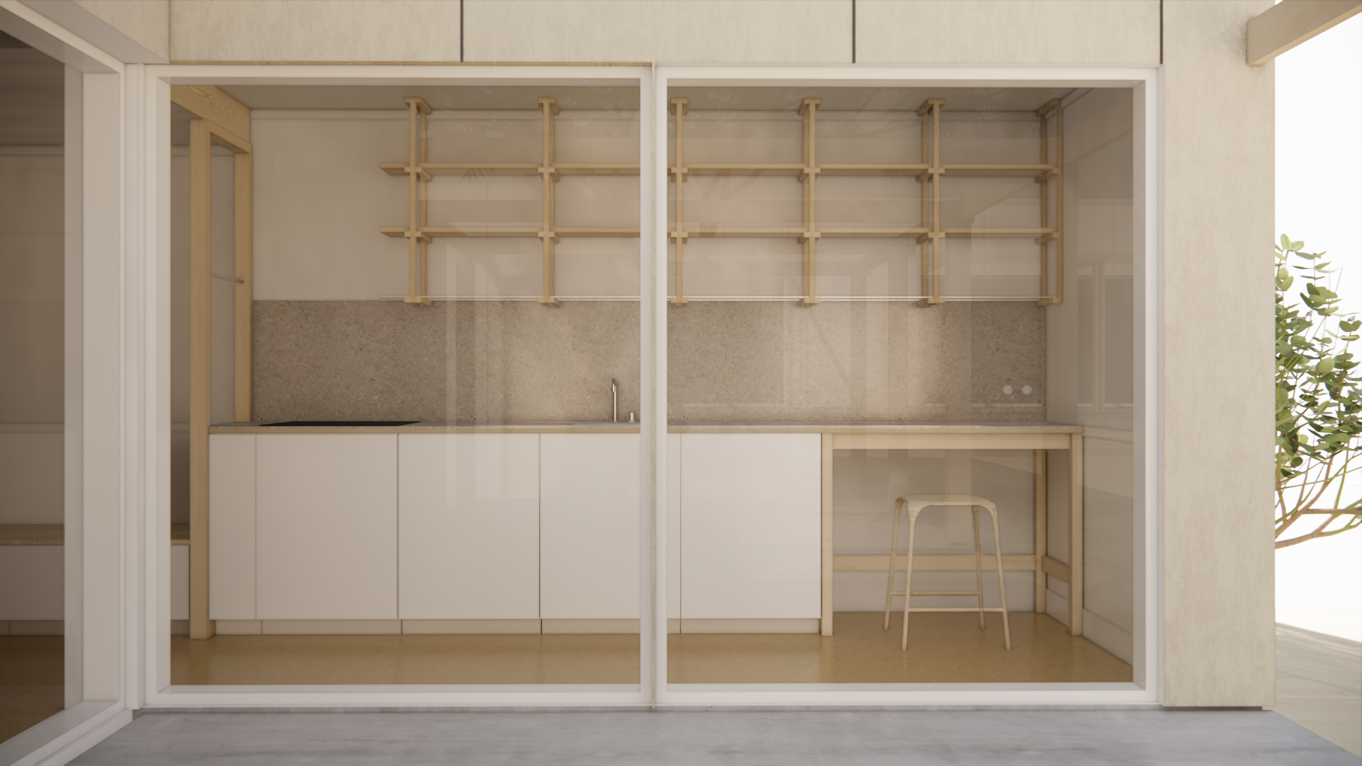 Studion kännetecknas av en multifunktionell och utenära arbetsbänk som först och främst vänder sig mot gårdsrummet och fungerar som ankare för den fria rörelsen mellan inne och ute.Vägghyllan är utformad med ett nedre hyllplan i galler för avrinning eller upphängning av kärl och redskap..