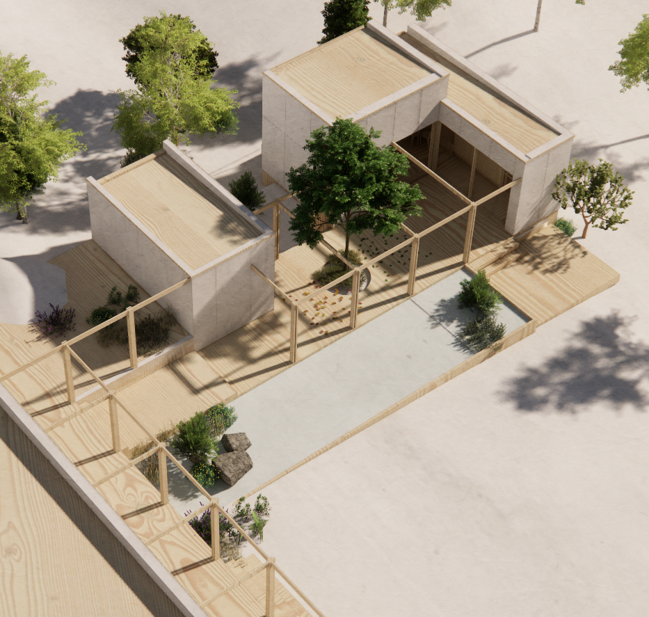 Projektet omfattar nybyggnad av trädgårdsstudio och trädgårdsbod samt omvandling av utemiljön i anslutning till ett enfamiljshus i Nacka. Med målsättningen att skapa mindre rumsligheter i övergången mellan inne- och utemiljö har de små huskroppanra placerats i nära förhållande till varandra och det befintliga huset och inordnats i lätt pergolastruktur. En långsmal naturpool markerar övergången mellan den mer kultiverade utemiljön och den vildare.