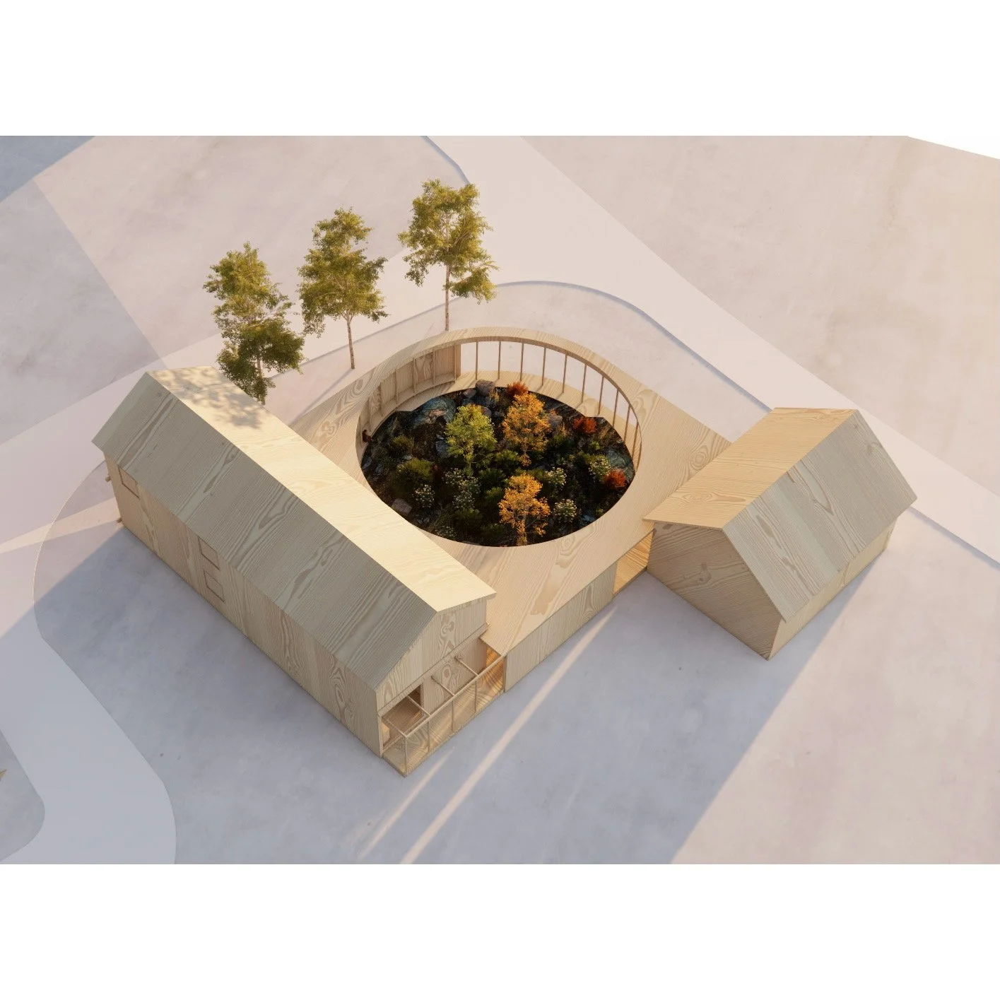 Husets material speglar landskapets palett med björk, gran och kärnfur. Konstruktionen är fri från plaster, och väggar samt tak är isolerade med linfibrer enligt nordiska byggtraditioner.